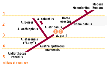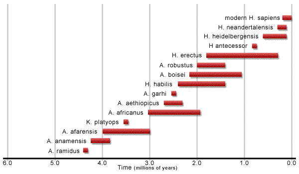 the straight line from Ardipithecus ramidus to Modern Humans as depicted here might suggest anagenesis, or species replacing species in linear fashion.