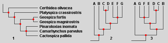 available data. In this cladogram for Darwin's Finches, the bottommost group of three species is said to be unresolved. The red dots indicate