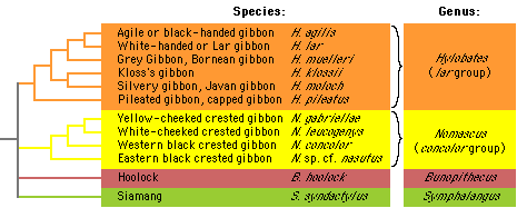 Fig.: Provisional classification of the Hylobatidae. From: Gibbon Research Lab. Divisions based upon diploid chromosome counts: Hylobates 44, Nomascus 52, Bunopithecus 38, Symphalangus 50. The name Hylobates is here retained. |