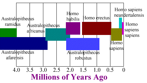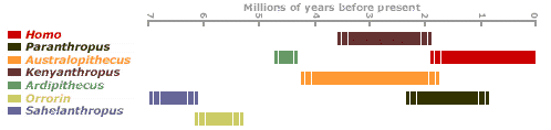Here is another colorful presentation that leads one to ask questions. What is that gap between H. habilis and H. erectus? Temporally they overlap