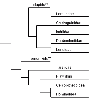 level family or higher within the order that includes all primates. Some fossil species are shown, and three families within the Prosimians are