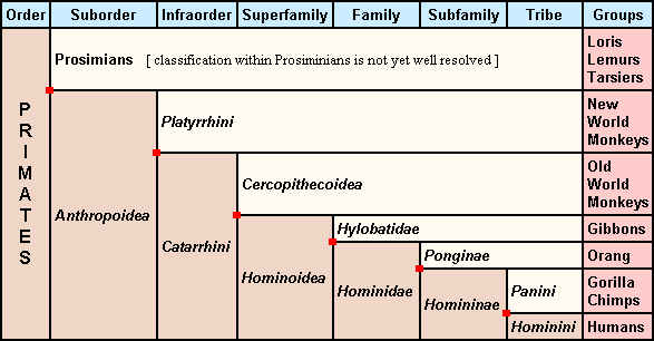 In the arrangement shown above, gorilla and chimps are placed in one tribe while humans are in an equal tribe or sister group (taxon). A red dot